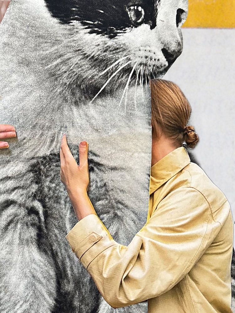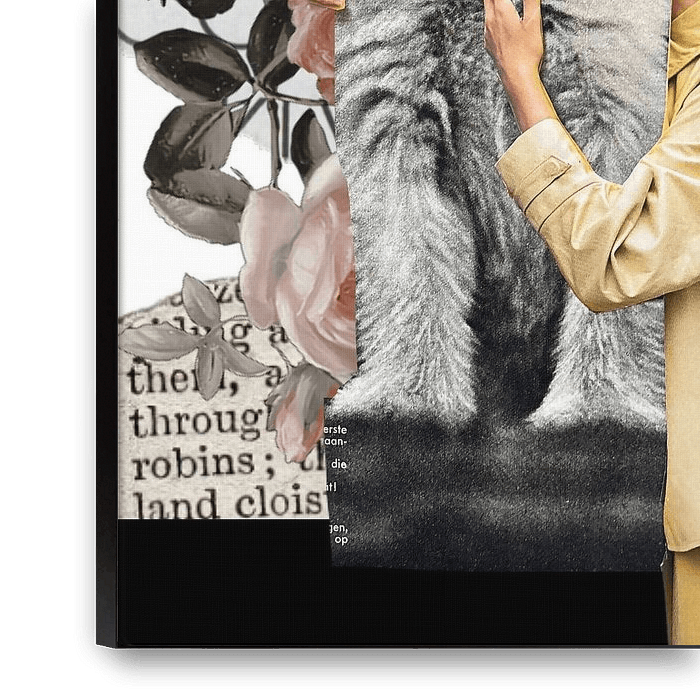 Eine Begegnung zwischen Damals und Heute In dieser Collage verschwimmen die Grenzen der Zeit durch eine besondere Umarmung. Zwischen Mensch und Tier: Im Mittelpunkt des Werks steht eine zärtliche Begegnung zwischen zwei Welten: eine Frau, kraftvoll und klar aus der zeitgenössischen Bildkultur herausgeschnitten, die sich liebevoll im…