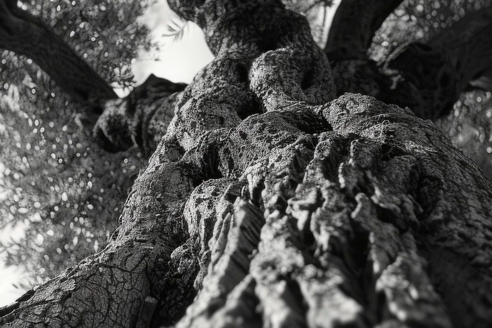 Dieses beeindruckende Schwarz-Weiß-Foto eines uralten Olivenbaums strahlt Stärke und Ewigkeit aus. Die detaillierte Struktur der knorrigen Rinde und die majestätischen, verzweigten Äste ragen kraftvoll in den Himmel. Die kontrastreichen Töne und die dramatische Perspektive verleihen diesem Kunstwerk eine tiefe, emotionale Wirkung, ideal für Natur- und Schwarz-Weiß-Fotografie-Liebhaber. Perfekt für Wohnzimmer oder Arbeitsräume, die ein Statement setzen wollen.