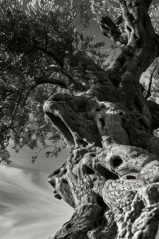 Dieses beeindruckende Schwarz-Weiß-Foto eines uralten Olivenbaums strahlt Stärke und Ewigkeit aus. Die detaillierte Struktur der knorrigen Rinde und die majestätischen, verzweigten Äste ragen kraftvoll in den Himmel. Die kontrastreichen Töne und die dramatische Perspektive verleihen diesem Kunstwerk eine tiefe, emotionale Wirkung, ideal für Natur- und Schwarz-Weiß-Fotografie-Liebhaber. Perfekt für Wohnzimmer oder Arbeitsräume, die ein Statement setzen wollen.
