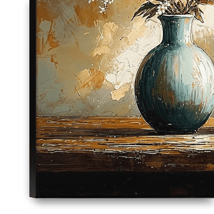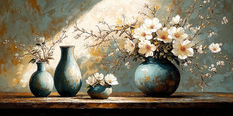 Dieses Kunstwerk strahlt eine ruhige Eleganz aus, wobei die zarten weißen Blüten einen schönen Kontrast zu den robusten türkisfarbenen Vasen bilden. Das weiche, warme Licht schafft eine ätherische Atmosphäre, während die strukturierten Pinselstriche der Komposition Tiefe und Leben verleihen. Die subtile Balance zwischen den organischen…