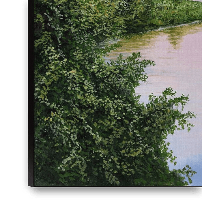 Das Bild vermittelt eine ruhige, fast meditative Atmosphäre, die den Betrachter in eine friedliche Abendstimmung eintauchen lässt. Im Vordergrund verläuft ein sanft plätschernder Fluss, dessen Wasser in weichen Wellen an die Uferbank schlägt. Der Fluss selbst spiegelt die umgebende Natur wider – die Bäume am Ufer, deren Blätter im…