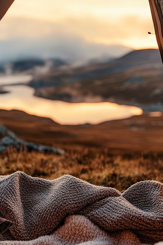 Stell dir vor, du liegst auf einem weichen Schlafsack, während die letzten Sonnenstrahlen den Horizont kissen. Die sanften Hügel spiegeln sich im stillen Wasser, und eine warme Atmosphäre lädt zum Entspannen ein. Dieses Bild, das die Magie des Campings einfangen, verleiht deinem Wohnzimmer eine entspannte, naturnahe Note.