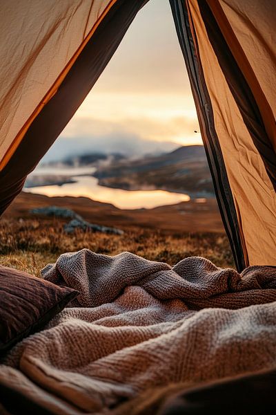Bestelle dieses Landschafts-Wandbild Zeltblick auf idyllische Berglandschaft von Poster Art Shop als Reproduktion auf Leinwand, Alu-Dibond, als Poster, Fototapete oder Acrylglasbild.