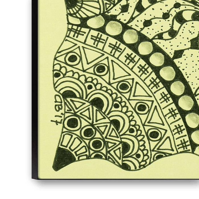 Hinweis: diese Technik zeigt bij vergrößern die sichtbaren Stiftstriche. Dies ist aufgrund des ursprünglichen Werks. Es ist jedoch authentisch und gehört ganz speziell zu dieser Kunstform. Der Zentangle ist tatsächlich eine Federzeichnung, die aus gezeichneten Linien besteht, die zusammen Muster bilden. Indem man jede Linie bewusst und gerichtet zeichnet, erhöht das Zeichnen eines Zentangle die Aufmerksamkeit des Künstlers, der es zeichnet.