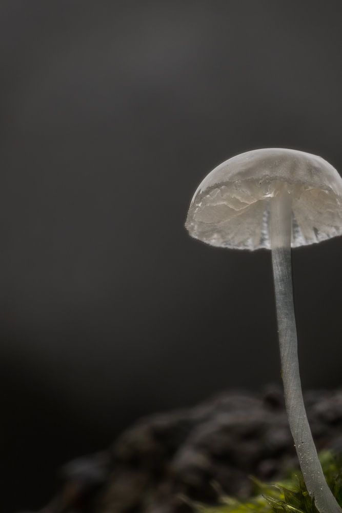 Ein kleiner Mykene, nicht größer als ein Stecknadelkopf, zerbrechlich und durchsichtig, wächst auf einem Flechtenstück.