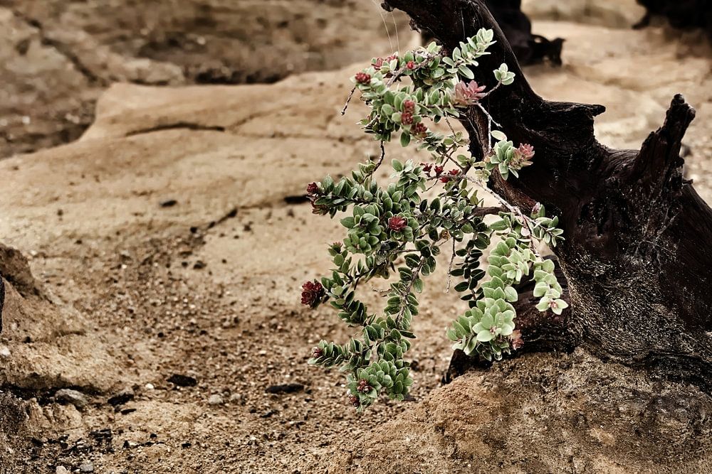 Inmitten dieser trockenen Vulkanlandschaft scheint eine kleine Pflanze das Unmögliche herauszufordern. Um sie herum trägt die Erde die dunklen Spuren der Vergangenheit: verbrannte Stämme, verkohlte Wurzeln, trockener Staub, Risse, die von Säure und Wind geformt wurden. Doch inmitten dieser Überbleibsel aus Feuer und Schwefel erhebt sich ein winziges Stück Leben, fast zerbrechlich, fast unsicher - aber zweifellos lebendig. Seine kleinen rosafarbenen Blätter und Knospen sorgen für eine unerwartete Nuance, wie ein Atemzug in einem erstarrten Universum. Das Bild erinnert an Resilienz, Hoffnung und die Fähigkeit der Natur, sich zu regenerieren, wo alles verloren scheint. Man stellt sich Vulkangase, sauren Regen und schlechte Böden vor, und trotz allem findet diese Pflanze die nötige Energie, um zu wachsen. Die Silhouetten der Hügel in der Ferne erinnern an die vulkanischen Reliefs Indonesiens - eine Welt, in der das Feuer mit der Erde verschmilzt, wo die Zyklen von Zerstörung und Schöpfung endlos ineinander übergehen. Hier zeigt uns die Natur, dass sie selbst in ihrer größten Härte eine geheime Kraft bewahrt, um neu anzufangen.