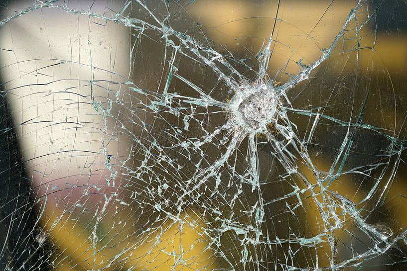 Zerstörte kaputte Fensterscheibe, mit der Struktur von zerstörtem gesplittertem Glas an einem Eisenbahnwaggon im Bahnhof in Magdeburg in Deutschland