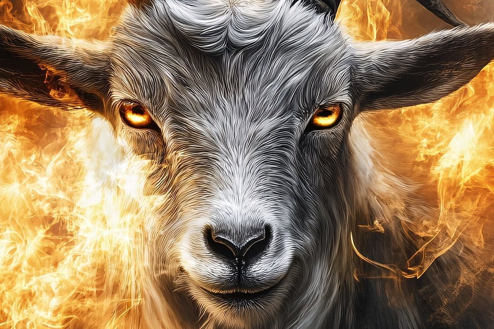 Dieses Bild zeigt eine beeindruckende Ziege mit feurigen Augen, umgeben von einem dramatischen Flammeneffekt. Das Design strahlt Kraft und Mysterium aus und ist perfekt für alle, die ein kühnes Kunstwerk suchen, das die Aufmerksamkeit auf sich zieht. Die realistischen Details des Fells und der Hörner erwecken die Ziege zum Leben, während der feurige Rahmen ein Gefühl von Energie und Kraft vermittelt. Dieses Kunstwerk passt gut in ein modernes Büro oder Schlafzimmer, wo es als starker Blickfang fungieren kann. Ein visuelles Spektakel, das jedem Raum eine einzigartige Atmosphäre verleiht.