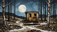 ein reich verzierter Zigeunerwagen steht einsam in einem nächtlichen Wald