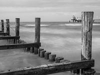 Buhnen in der Ostsee bei Zingst mit Seebrücke im Hintergrund, monochrome Langzeitbelichtung
