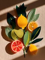 Bestelle das digitale Kunst Bild Zitronen und Grapefruit – botanische Collage von Erika Kaisersot als Reproduktion auf Leinwand, Alu-Dibond, als Poster, Fototapete oder Acrylglasbild.