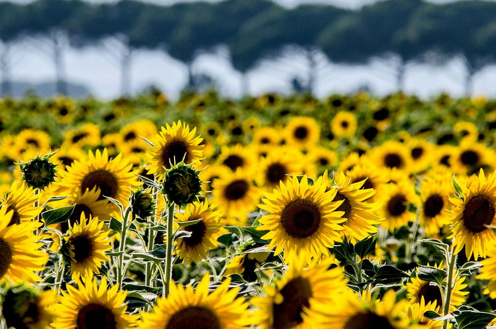een veld zonnebloemen in het Italiaanse Toscane met cipresbomen op de achtergrond