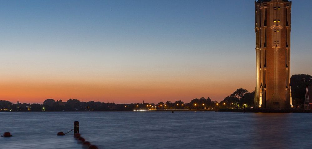 Zonsondergang bij de hoge watertoren aan de Westeinderplassen nabij Aalsmeer, Holland. Nederland. Mooie panorama.