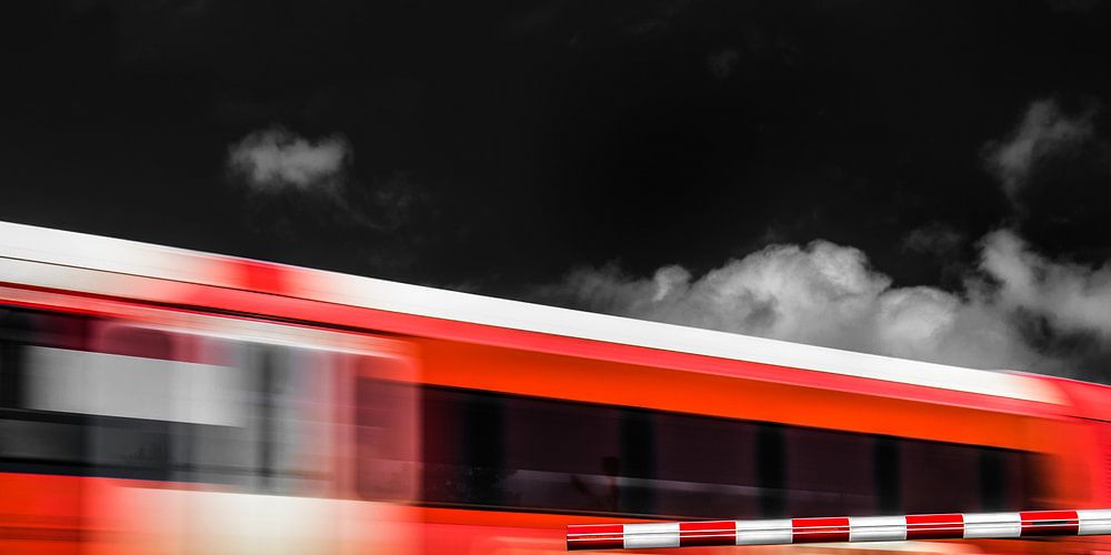 Ein rot-weißer Zug passiert mit hoher Geschwindigkeit einen Bahnübergang in der Nähe des friesischen Dorfes Deinum, wodurch die Bewegung deutlich sichtbar wird.