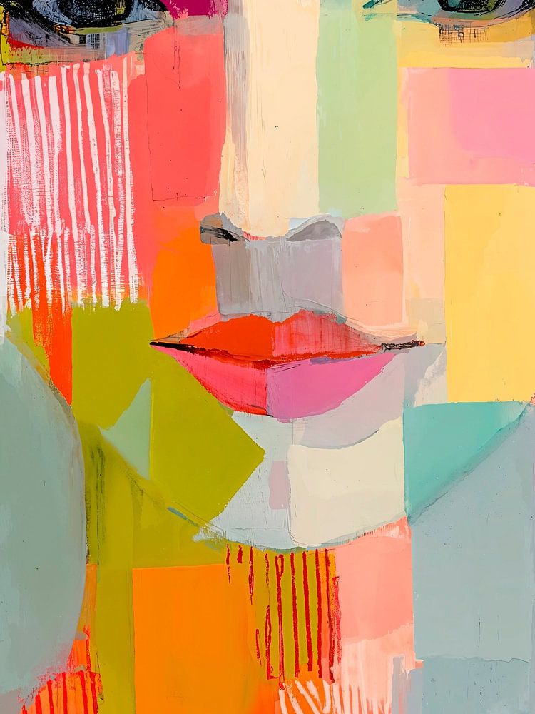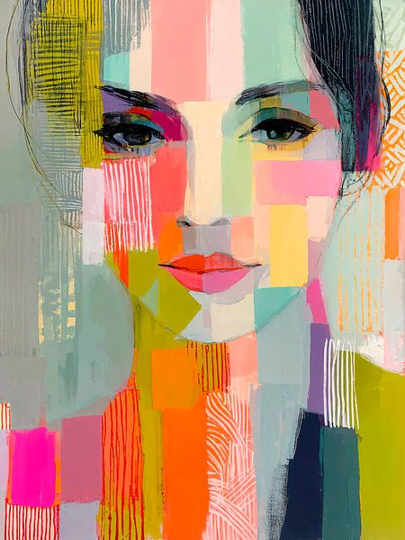 Ein lebendiges und abstraktes Porträt eines Frauengesichts, dargestellt in einem ausdrucksstarken Stil. Das Kunstwerk zeichnet sich durch ein dynamisches Zusammenspiel von Farben und Streifen aus. Der Gesamteindruck ist geprägt von energiegeladener Spontaneität und moderner Kunstfertigkeit.