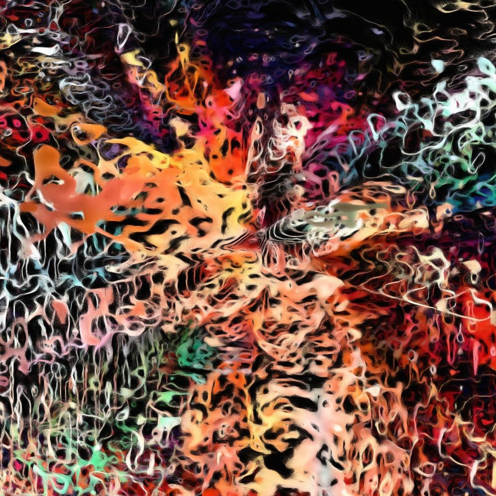 Abstrakte digitale Gouache-Malerei in blauen, roten, grünen, orangen und gelben Tönen