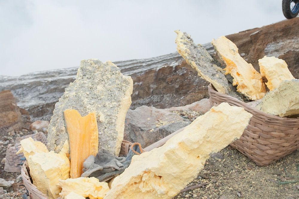 Ijen Vulkan Java Indonesien. Späneblöcke, die unter gefährlichen Bedingungen aus der Mitte des Vulkans abgebaut werden.
