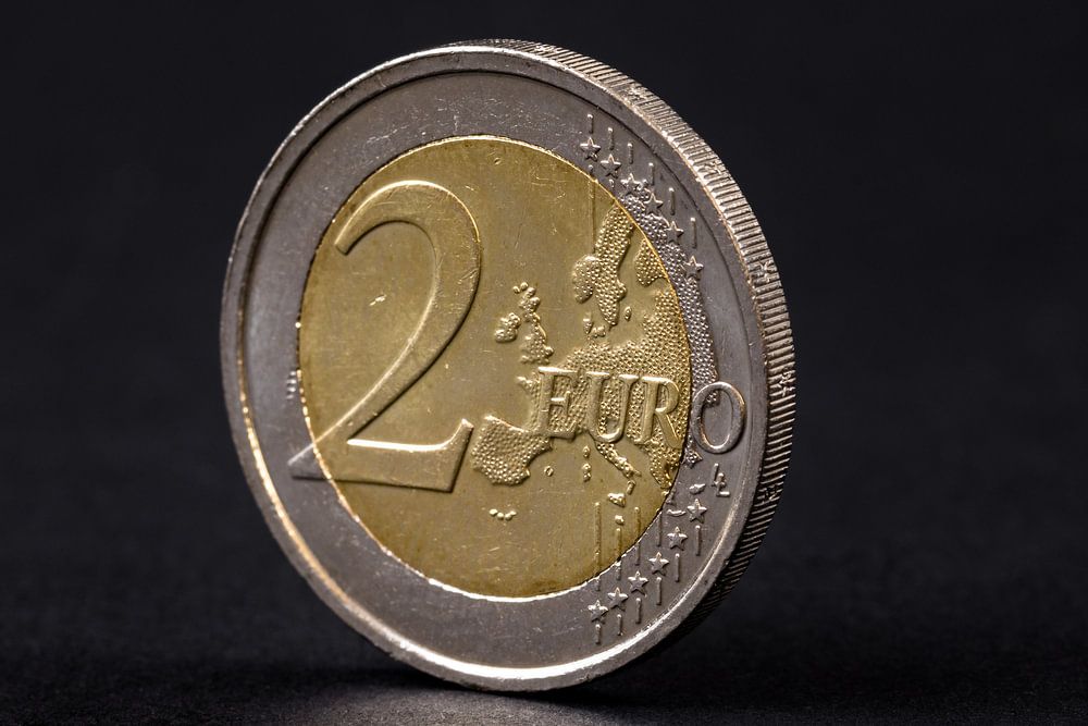 Studio-Makroaufnahme einer Zwei-Euro-Münze vor dunklem Hintergrund