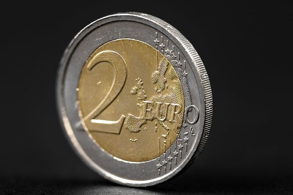 Studio-Makroaufnahme einer Zwei-Euro-Münze vor dunklem Hintergrund
