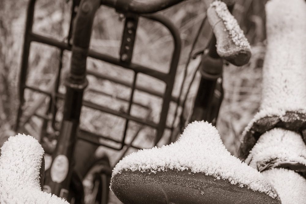 Zwei Fahrräder sind dort mit dicken Schlössern an einen Balken gebunden, und inzwischen sind die Sättel und auch die Lenker eingefroren. Das gibt ein schönes Bild ab.