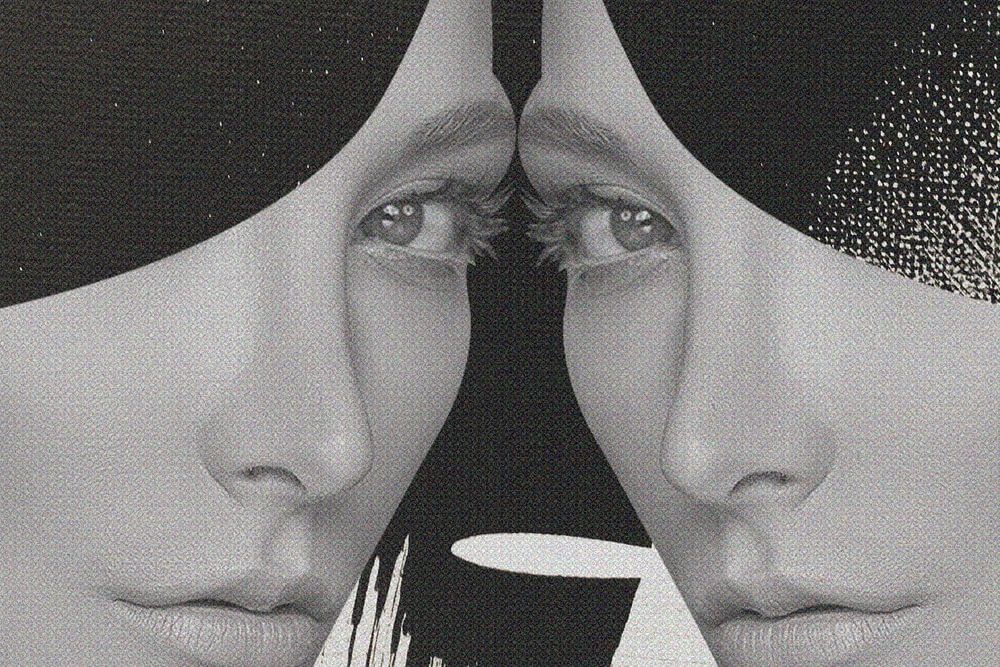 Surrealistisches Bild mit zwei Frauengesichtern auf abstraktem Hintergrund. Der Hintergrund wirkt wie eine optische Täuschung. Sind es Haare oder sind es nur zwei halbe Gesichter auf einem Hintergrund?