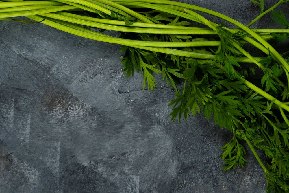 Zwei orangefarbene Möhren, Waldmöhren, mit grünem Laub verflochten auf dunkelgrauem Hintergrund.