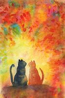 Zwei Katzen sitzen nebeneinander und blicken in den Sonnenuntergang. Die Katzen sind als Silhouette dargestellt, die linke Katze in dunkleren Farben, die rechte Katze in Rottönen. Die beiden Tiere werden umgeben von einer leuchtenden Explosion aus Rot-, Orange- und Gelbtönen. Das bunte Herbstlaub, von der Herbstsonne angestrahlt, fällt…