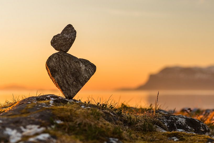 Steinherzen im Sonnenuntergang am Lavangsfjord, nördlich Steinsland, Norwegen
