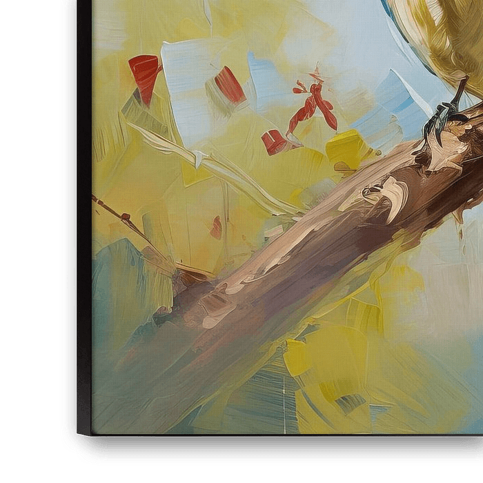 Two Colourful Birds | Birds Impressionism - Mit lockerer Pinselführung fängt dieses lebendige Gemälde zwei ruhende Vögel auf einem Ast vor einem weichen Hintergrund aus erfrischenden Blautönen und warmen Gelbtönen ein. Das Spiel von Licht und Schatten erweckt das Gefieder und die Texturen der Vögel zum Leben, während die dynamischen Pinselstriche ein modernes, impressionistisches Flair erzeugen.