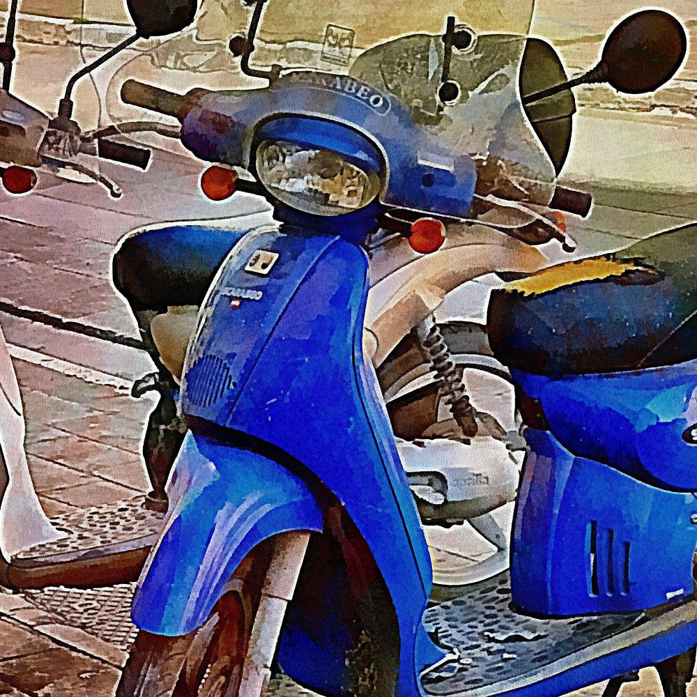 Zwei geparkte Scarabeo-Roller in einer kleinen Stadt in Mittelitalien. Der blaue Roller zeigt deutliche Gebrauchsspuren, da der Sitz an einigen Stellen bis auf die Schaumstoffunterlage abgenutzt ist. Der Scarabeo, benannt nach dem ägyptischen Skarabäuskäfer, wird von dem italienischen Motorradhersteller Aprilia produziert, der zu Piaggio gehört.