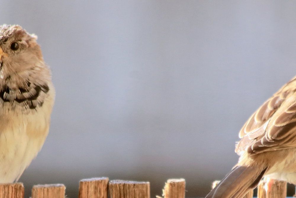 Der häufigste Vogel in den Niederlanden, der kleine Haussperling, sitzt auf einem Zaun im Garten.