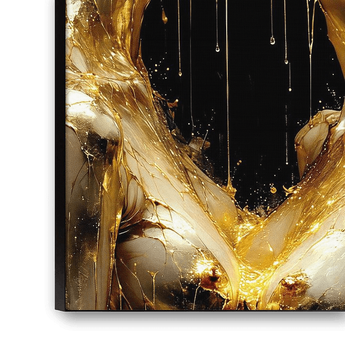 Über ihre entblößten Körper ergießt sich flüssiges Gold – wie eine leuchtende Dusche aus metallischem Licht. Es rinnt über Haut und Konturen, sammelt sich in glänzenden Tropfen, die langsam von Kinn und Schultern herabgleiten. Das Gold wirkt wie ein Strom der Metamorphose, der das Menschliche in etwas Kostbares, Zeitloses verwandelt.