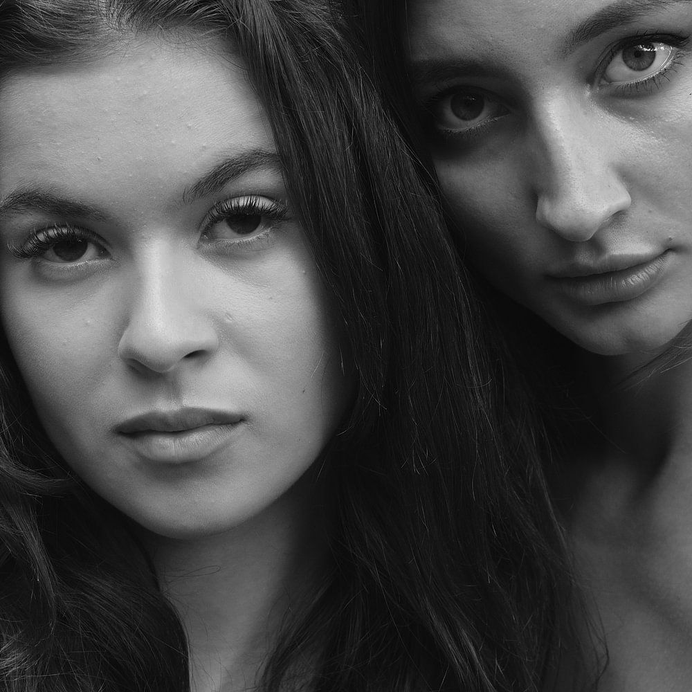 Künstlerische und erotische Schwarz-Weiß-Fotografie von zwei schönen nackten Frauen im Garten einer Ornamentwerkstatt.