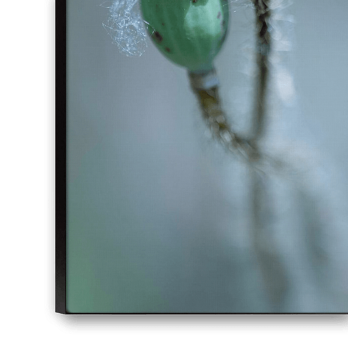 Fotografie von 2 Samenkapseln des verblühten Mohns in inniger Umarmung, umschlungen vom Flaum der Pappelbäume. Die weiche Schärfentiefe mit dem scharfen Keimling im Vordergrund macht das Foto zu einem Vergnügen für den Betrachter. Ein Foto, das Ruhe in den Innenraum bringt.