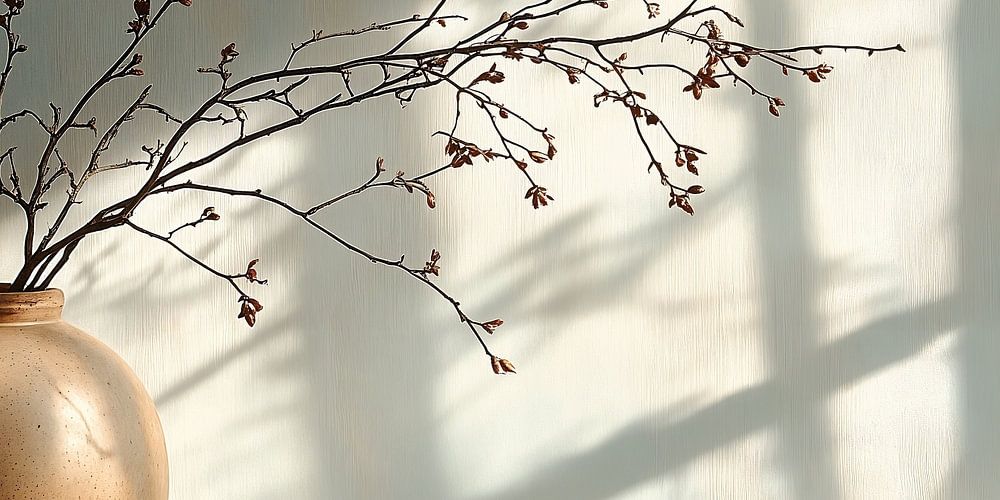 Diese minimalistische Komposition fängt die Essenz eines frühen Frühlingsmorgens ein. Eine schlichte, erdbraune Keramikvase beherbergt kahle Zweige mit aufkeimenden Knospen, getaucht in warmes Morgenlicht. Das dramatische Schattenspiel, das durch ein unsichtbares Fenster geworfen wird, erzeugt einen faszinierenden Kontrast auf der hellen Wand und der Holzoberfläche. Die Fotografie betont Texturen und subtile Farbschattierungen, während die Komposition ein Gefühl von Raum und Gelassenheit hervorruft. Dieses Bild vereint die raue Einfachheit der Natur mit der raffinierten Ästhetik des Japandi-Stils und ergibt eine besinnliche Szene, die das stille Versprechen des Frühlings verkörpert.
