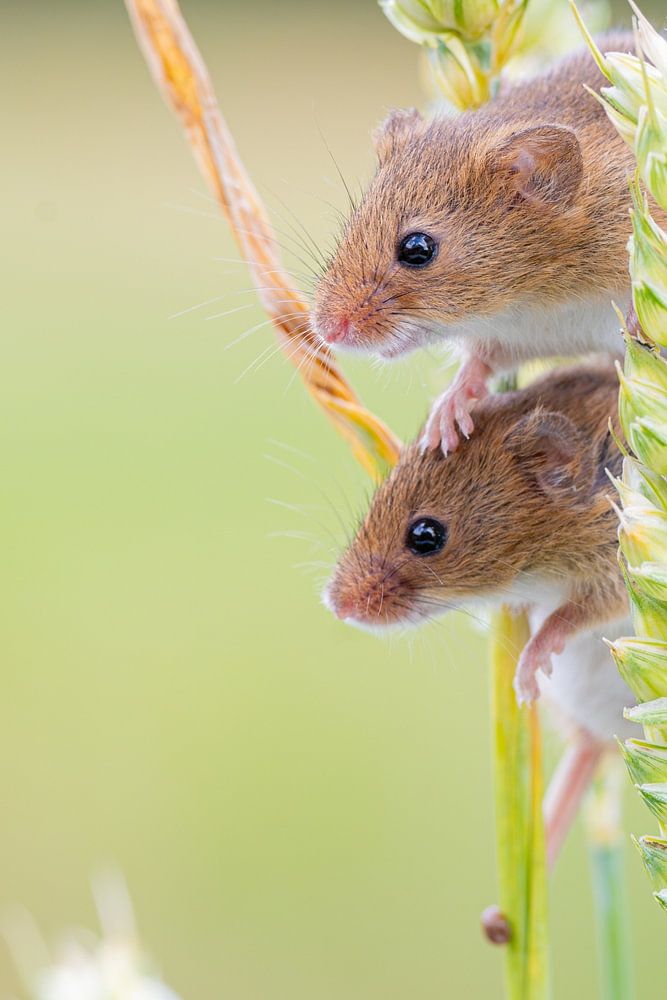 Diese Zwergmaus, die von Natur aus gerne auf Getreidehalme klettert, balancierte, um oben zu bleiben. Die Maus hebt sich gut von der grünen Umgebung ab