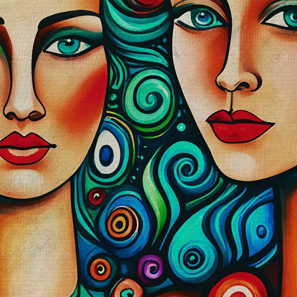 Dieses Werk aus der Serie Zwillingsschwestern habe ich geschaffen, um die enge Beziehung zwischen Zwillingen zu betonen. Ich habe mich hier bewusst für weibliche Zwillinge entschieden, weil "normale" Schwestern oft widersprüchliche Persönlichkeiten haben und manchmal miteinander streiten können. Zwillingsschwestern sind anders, sie sind mehr aufeinander eingestimmt, so scheint es mir zumindest. Es könnte sein, dass ich mich gründlich irre, und wenn dem so ist, denke.... arme Mann, er weiß nicht, wovon er spricht, also nehmen Sie diese Arbeit mit einem Lächeln und füllen Sie den zugrunde liegenden Gedanken selbst aus.