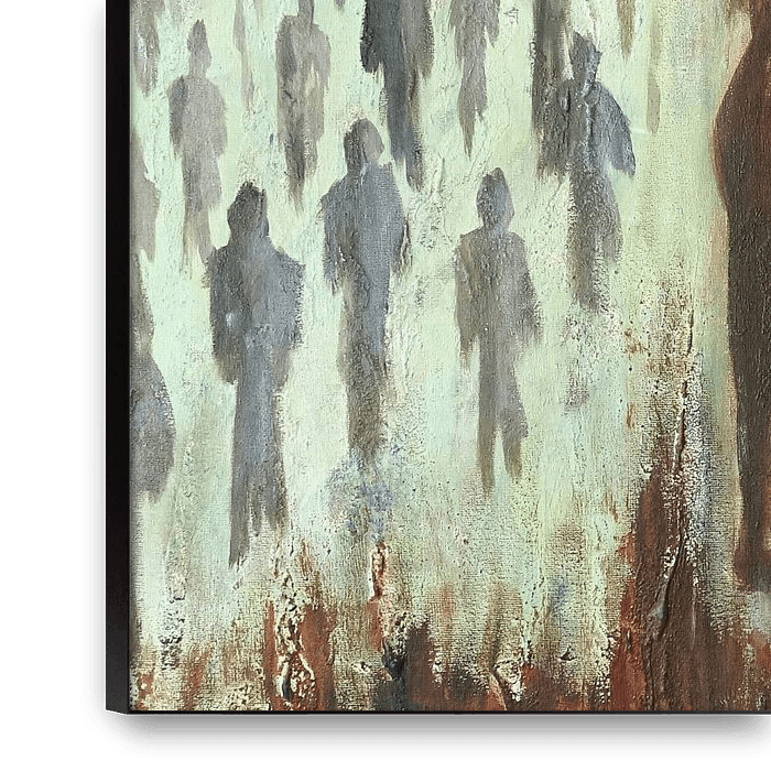 Die Geschichte hinter „Between Holding On and Letting Go” Dieses Gemälde symbolisiert die stille Spannung zwischen Festhalten und Loslassen. Zwei Liebende stehen gemeinsam unter einem Regenschirm. Der Regenschirm steht als Symbol für Vertrauen, Schutz und die Entscheidung, trotz Unsicherheit zusammenzubleiben.