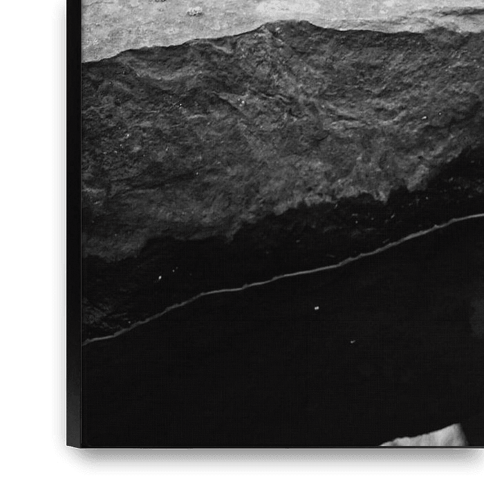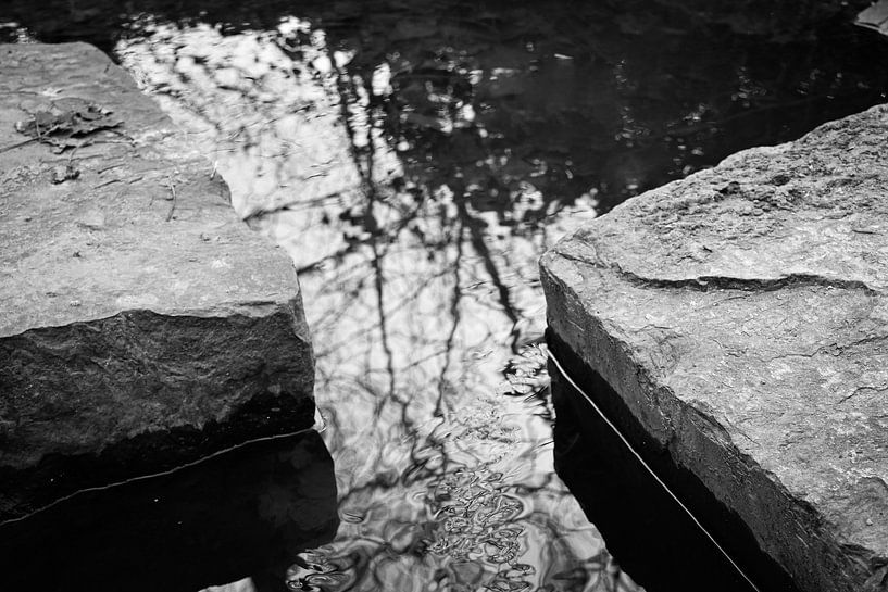 In diesem ruhigen Schwarz-Weiß-Bild treffen die harte Oberfläche der Felsen und die sanften Wellen des Wassers aufeinander. Die Reflexion der Bäume in der dunklen Wasseroberfläche erzeugt ein fast abstraktes Muster. Eine beruhigende Komposition, die sich wunderbar in großem Format in einem Raum eignet, in dem Ruhe und Natur gefragt sind.
