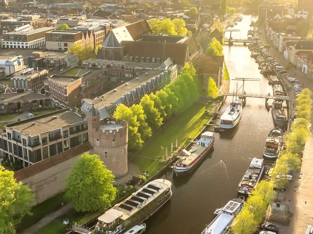 Luftaufnahme des Stadtzentrums von Zwolle während eines Sonnenuntergangs im frühen Frühling. Von oben gesehen können wir verschiedene historische Gebäude an der Thorbeckegracht sehen.
