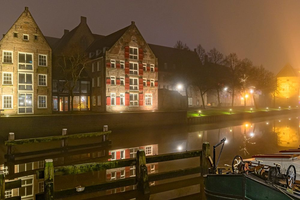 Abendlicher Blick über die Thorbeckegracht in der Stadt Zwolle an einem kalten Winterabend. Die Thorbeckegracht ist eine historische Gracht in Zwolle, Niederlande. Sie ist nach Johan Rudolph Thorbecke benannt, einem niederländischen Staatsmann aus dem 19. Jahrhundert, der eine Schlüsselrolle bei der Gestaltung des niederländischen Verfassungssystems spielte. Der Kanal ist Teil der alten Stadtbefestigung von Zwolle und trägt zur malerischen, mittelalterlichen Atmosphäre der Stadt bei. Er ist gesäumt von charmanten alten Lagerhäusern, historischen Gebäuden und Hausbooten.