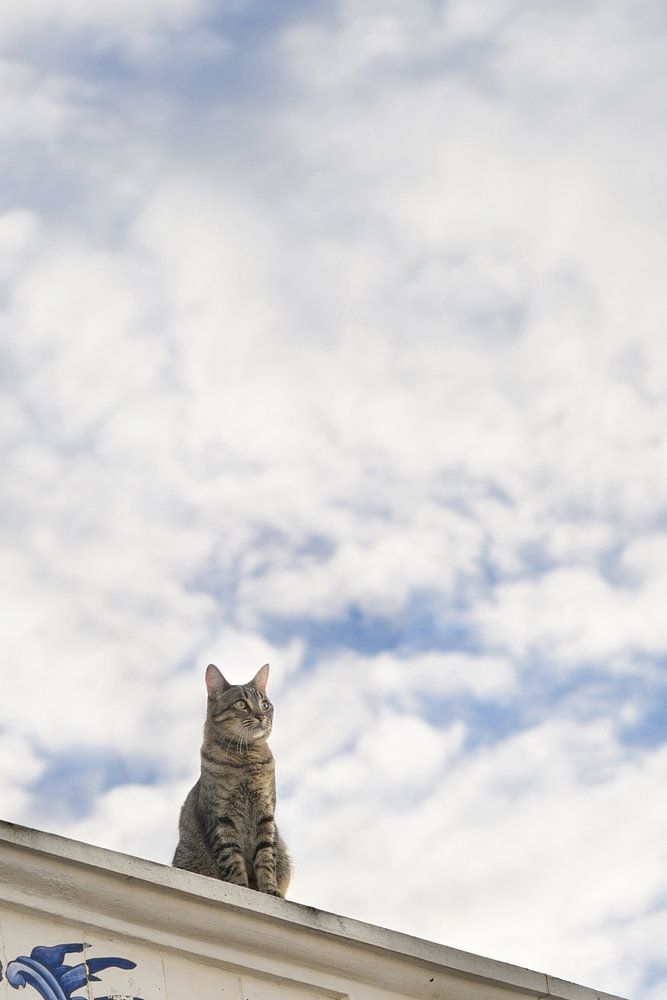 An einem sonnigen, teilweise bewölkten Tag spazierte ich durch die Küstenstadt Lagos an der Algarve in Portugal. Ich war auf der Suche nach (Straßen-)Katzen zum Fotografieren. Am Ende des Vormittags hatte ich im gesamten Stadtzentrum keine einzige Katze gefunden, als ich plötzlich dachte, dass ich vielleicht nach oben schauen sollte. Und da saß diese hübsche, stolze Zypressenkatze und genoss die Sonne auf dem Dach eines Hauses. Die Dachrinne des Hauses war mit diesen schönen typisch portugiesischen Ziegeln verziert. Auch in einem Delfter Blau. Na sowas! Was für ein Glücksfall! Das musste ich natürlich festhalten. Ich schaue es mir immer noch regelmäßig an, weil die Katze ihre Freiheit so sehr genießt, was auch mir ein gutes Gefühl gibt. Und eine schöne Erinnerung an das besondere Portugal.