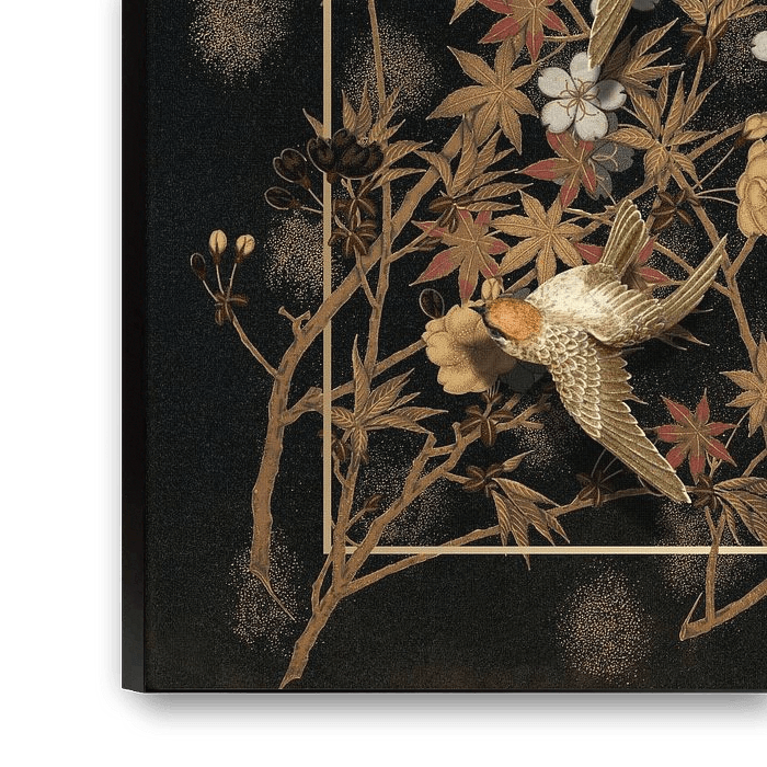 Zu sehen sind: schöne Blumen, goldene Details, Vögel.