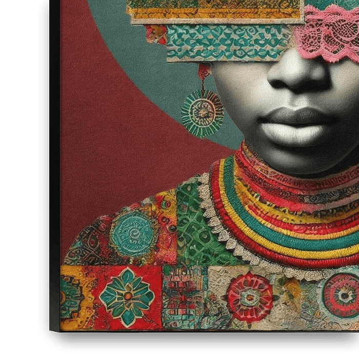 Eine Collage aus farbenfrohen Bildern mit Texturen und Streifen aus Stoff und Spitze, wie ein moderner Quilt.