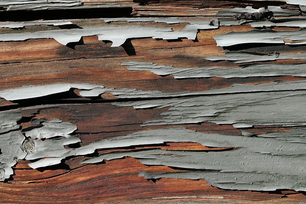 abblätternde alte graue Farbe auf einer Holzwand an einem maroden verwitterten Farbanstrich auf alten Bretten an einem Zaun