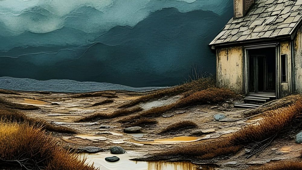 abgelegene Berghütte in einem Hochplateau, dunkle Wolken ziehen auf