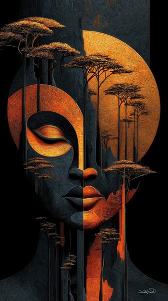 Entdecken Sie den Zauber Afrikas in Schwarz, Gold und Orange - eine exklusive Kunstserie voller Charakter