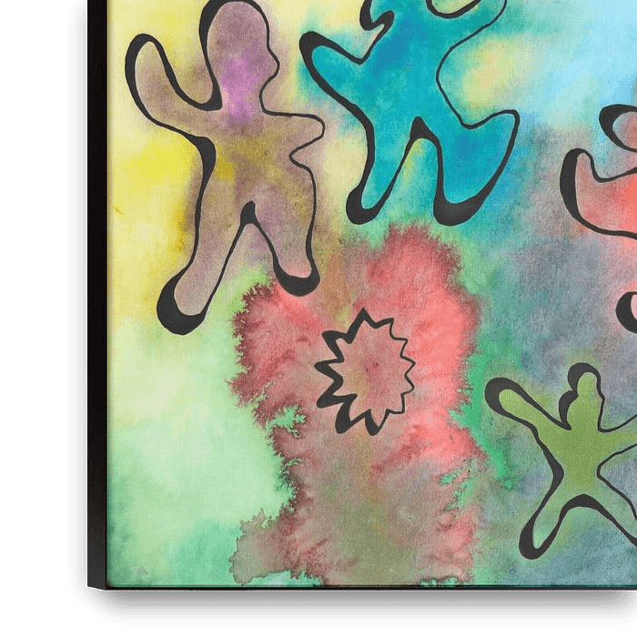 Ein Aquarell mit vielen verschiedenen fröhlichen tanzenden Kreaturen. Diese haben verschiedene Farben mit allen Farben des Regenbogens um sie herum. Eine kleine Party an der Wand.