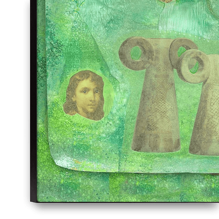Nennen Sie es Mixed Media, nennen Sie es Collagen: Was ich mache, ist das, was die Arbeit selbst verlangt. Manchmal viele Bilder, manchmal gezeichnet und koloriert, manchmal ein Hintergrund aus Aquarellfarben, manchmal aus Gelli-Drucken, manchmal mit Schablonen, manchmal mit Text. Manchmal ist eine Farbe der Ausgangspunkt, manchmal ein bestimmtes Bild, manchmal ein Text, eine Geschichte oder einfach das Bedürfnis, Motive zu färben oder sogar Nadel und Faden zu benutzen. So…