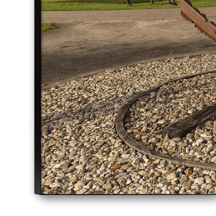 In dieser ergreifenden Aufnahme verschmelzen Geschichte und Landschaft auf dem Gelände des ehemaligen Transitlagers Westerbork. Die gebogenen, gewundenen Eisenbahnschienen sind das stille Herzstück des Bildes - ein starkes Symbol, das an die Tausenden von Menschen erinnert, die von hier aus mit dem Zug deportiert wurden. Das ruhige, offene Gelände und der markante Wachturm im Hintergrund stellen die historische Anklage auf eine zurückhaltende Weise dar: ohne Sensation, aber mit Respekt und Raum für Reflexion.